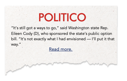 - Two years after the state government public option was implemented in the state, POLITICO reported that “costs have not come down enough yet to make a real dent in affordability or in the rates of uninsured and underinsured” and “the policies haven’t yet achieved the kind of sweeping change that proponents had hoped.” According to the Journal of the American Medical Association (JAMA), Washington’s public options plans have been “unsuccessful at securing meaningful rate cut.